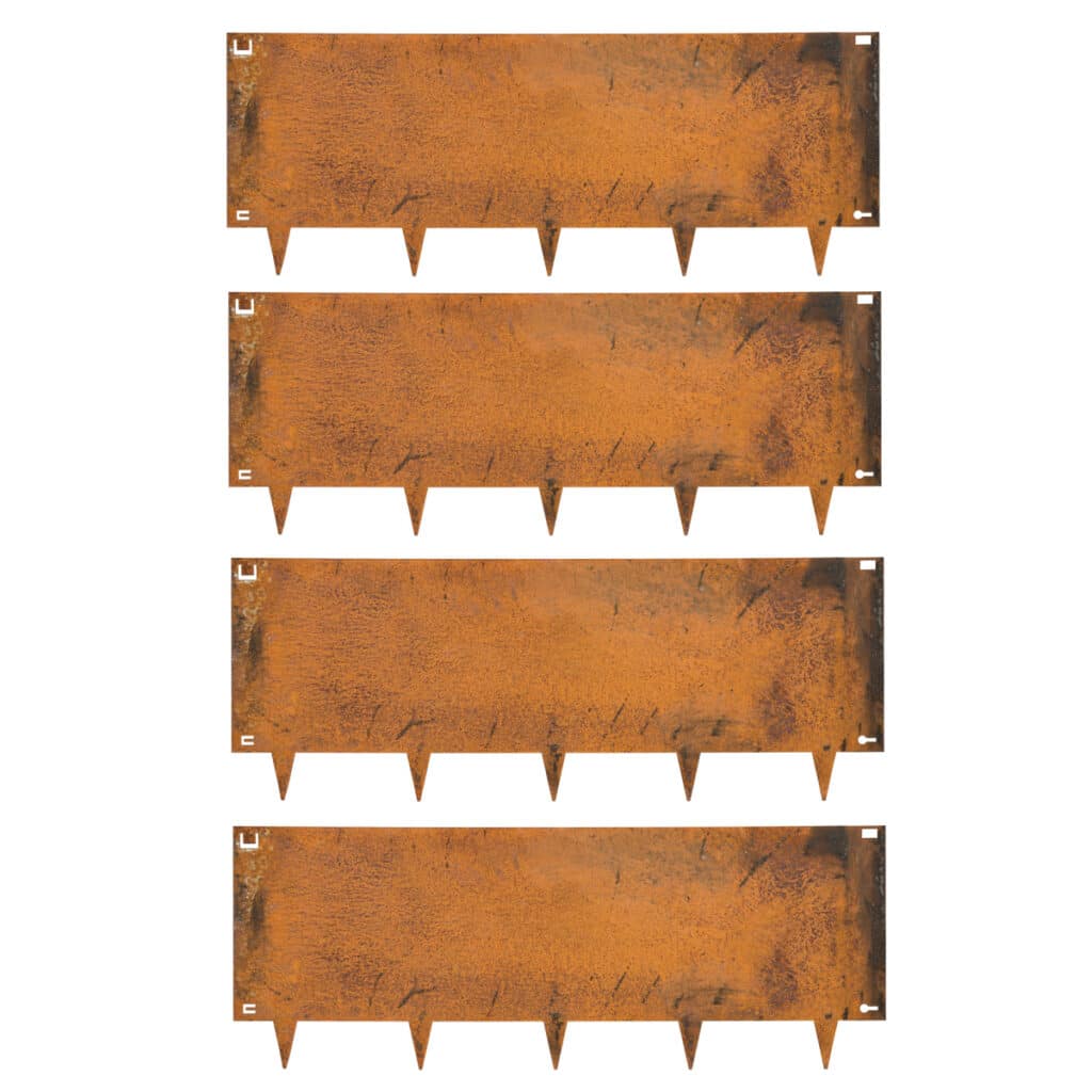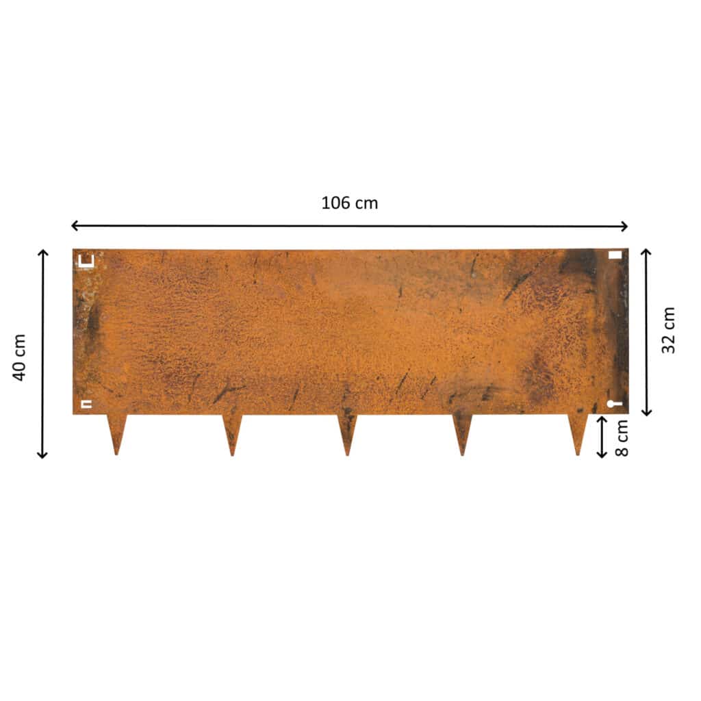 De totale hoogte van de borderrand is 40 cm, waarbij de pinnen 8 cm hoog zijn. De rand zelf is dus 32 cm hoog. De strips zijn 106 cm lang. Hiervan is 6 cm nodig voor het kliksysteem. De effectieve lengte van 1 strip is dus 1 meter. De effectieve lengte van deze set van 4 stuks is dus 4 meter. De dikte van deze cortenstaal borderrand is 1,5 mm.