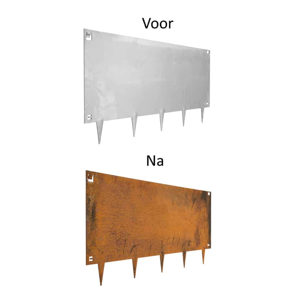 Wanneer de strips geleverd worden, hebben ze een metaalkleur. De roest ontstaat vanzelf. Dit duurt ongeveer 6 tot 12 maanden. Het is mogelijk om het oxidatieproces te versnellen, zodat de roestkleur sneller op het product te zien is. Hiervoor kunt u de volgende stappen volgen: