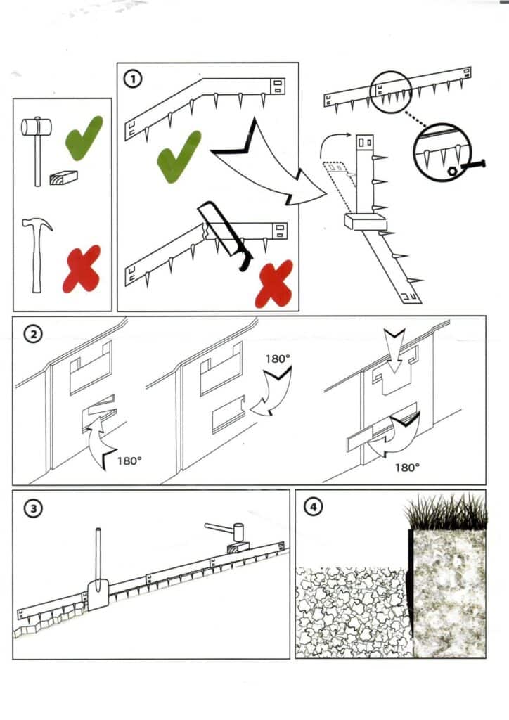 De borderrand is voorzien van een handig kliksysteem waardoor het heel eenvoudig is om hem te plaatsen. De cortenstaal borderrand kan in een strakke, rechte lijn geplaatst worden, maar kan ook gebogen worden tot scherpe of stompe bocht. Je buigt de strip eenvoudig door een baksteen of ander zwaar voorwerp op de plek te leggen waar de buiging moet komen. Vervolgens buig je de strip eenvoudig om de baksteen heen. Doordat de pinnen aan de rand vast zitten is het plaatsen extra makkelijk. Wanneer je simpelweg de 5 onderstaande stappen volgt, heb je de rand zo geplaatst.
