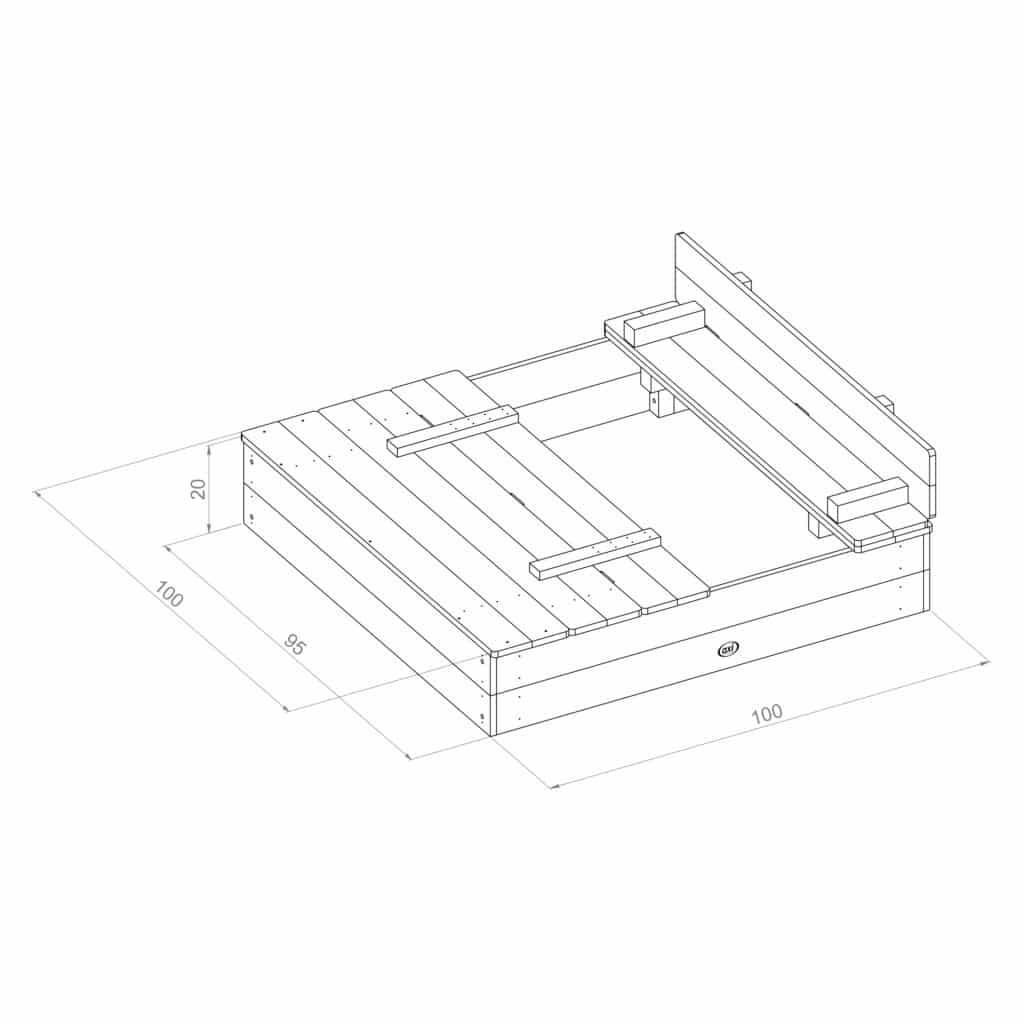 Veelzijdige zandbak met houten deksel, die gemakkelijk kan worden opengeklapt en dan twee bankjes vormt.