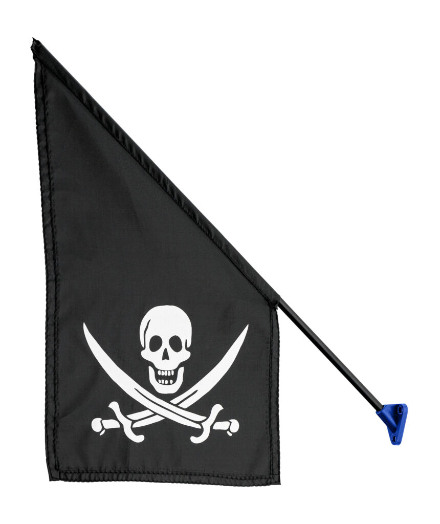 Stoere piratenvlag van katoen aan een plastic stok. Bereid jouw speeltoestel of speeltoren uit met deze piratenvlag en tover het toestel om tot een piratenschip!