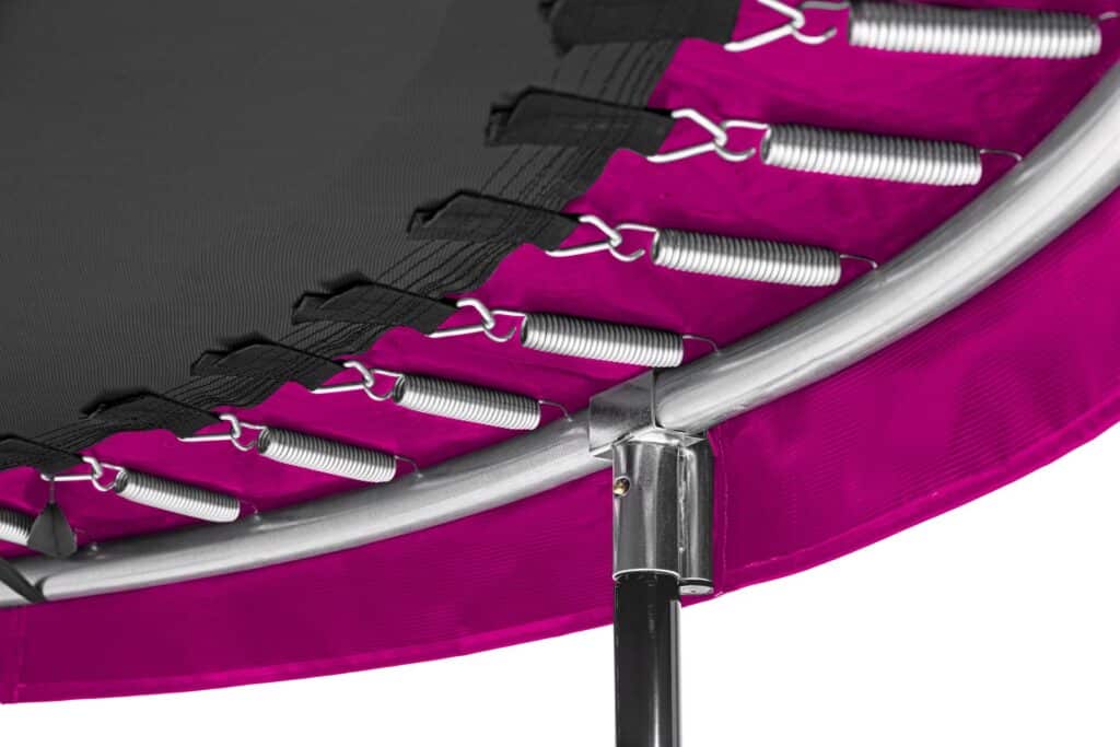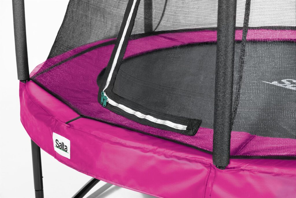 Het stalen frame is gegalvaniseerd, voorzien van een zwart glanzende coating en geeft de trampoline een veilige basis. Het veiligheidsnet is zodanig ontworpen dat het optimale bescherming en veiligheid biedt tijdens het springen. De constructie van de stalen topring zorgt er tevens voor dat het zachte, fijnmazige net in een elegante vorm wordt gehouden en daardoor extra mooi gespannen blijft. Daarbij is de ingang van het veiligheidsnet voorzien van een dubbelzijdige rits, zodat je de trampoline gemakkelijk kunt betreden en het net goed kan afsluiten.