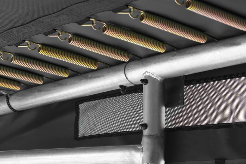 De veiligheidsrand van de Premium Ground is uitgerust met een geïntegreerd luchtstroom systeem, zodat de lucht die onder de springmat stroomt zich optimaal kan verplaatsen. Deze goede luchtcirculatie zorgt voor een geweldige springervaring. Bovendien beschikt de veiligheidsrand over extra dik PVC, voor de beste bescherming. De rand kan door middel van de bijgeleverde verankering set aan de grond worden bevestigd. De robuuste constructie verzekert een stevige basis en is volledig gegalvaniseerd, van binnen en buiten. Doordat de trampoline slechts 21,5 cm boven de grond staat, profiteer je van een veilige en lage op- en afstap. Kinderen kunnen de trampoline dus zonder moeite en risico betreden.