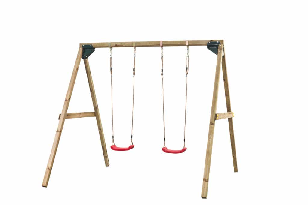 Complete dubbele schommel van vierkant hout. Schommelzitjes zijn verstelbaar in hoogte en ook te vervangen door andere accessoires. Schommel bestaat uit geïmpregneerd FSC hout dat jarenlang meegaat. Grondankers worden erbij geleverd.