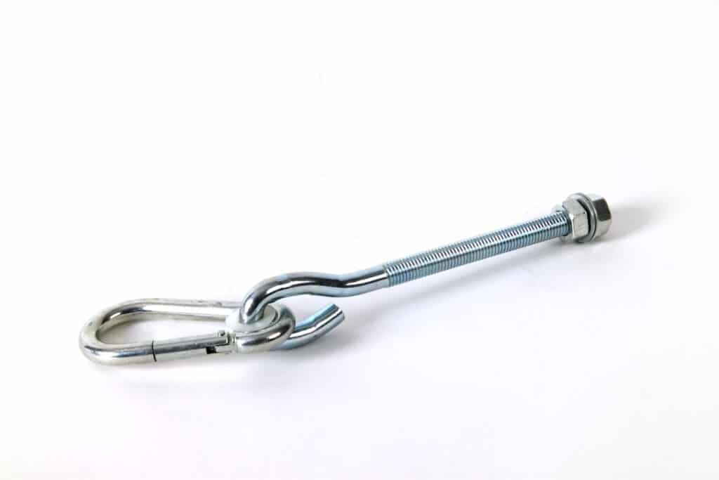 Schommelhaak M10 met karabijnsluiting en een lengte van 100mm. Geschikt voor alle houtsoorten.