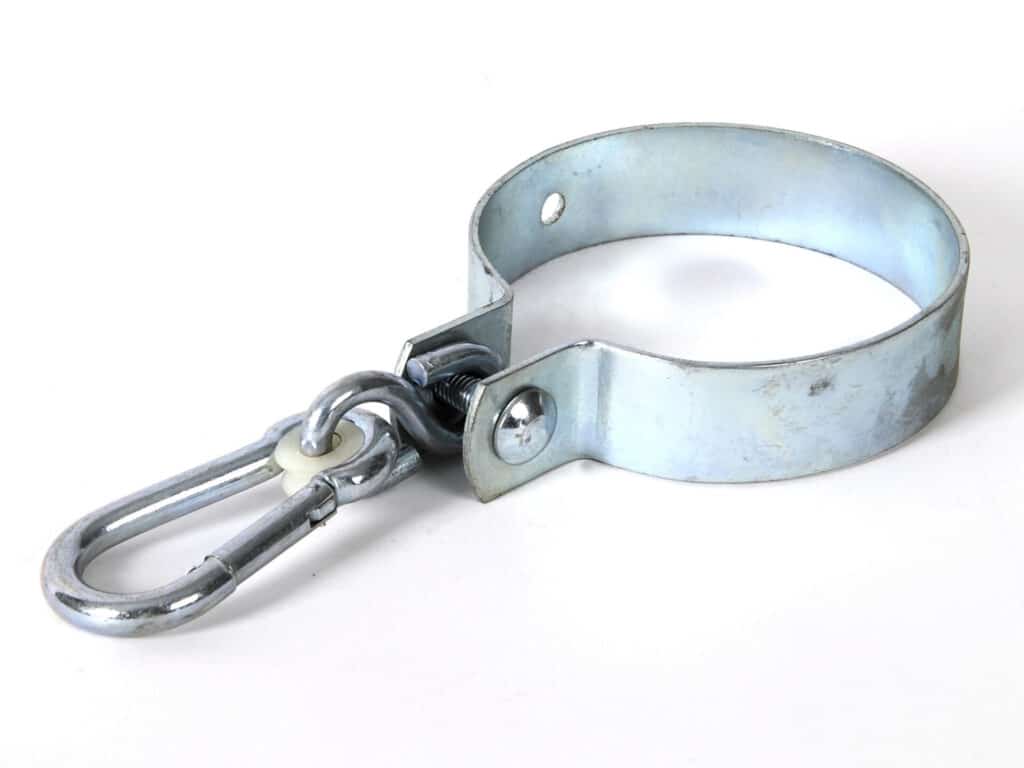 Schommelhaak rond verzinkt met een diameter van 120mm en heeft een dikte van 3mm. Geschikt voor bevestiging aan ronde palen.