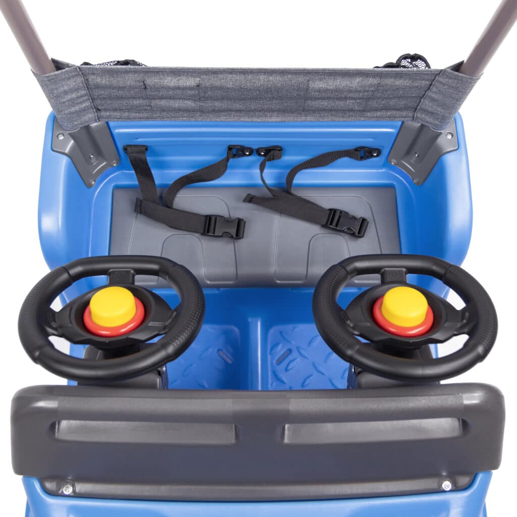 Breng het plezier van het buitenspelen naar een hoger niveau met het zij-aan-zij-ontwerp van deze tweezitter! Twee peuters kunnen comfortabel rijden in de gloednieuwe Side-By-Side Push Around SUV™ van Step2, elk met voorgevormde zittingen en veel beenruimte. Van de realistische off-road SUV-styling tot de grote wielen met draaibare besturing en extra opbergmogelijkheden onder de zitbank, deze tweezitter heeft zo veel functies die spanning toevoegen aan elk avontuur. Maak de riemen vast met de twee veiligheidsgordels en vouw de verstelbare kap naar beneden om deze op zijn plaats te houden voor een schaduwrijke rit. De kleintjes kunnen zelfs doen alsof ze met hun off-road terreinwagen rijden, elk met een eigen stuurwiel! Er is zelfs extra opbergruimte voor de ouders; berg de essentiële spullen voor de uitstapjes op in de gaaszakken achterop de basis van de luifel. Klaar om te rijden? Met deze tweepersoons duw auto is het een koud kunstje om in de buurt en daarbuiten te wandelen!