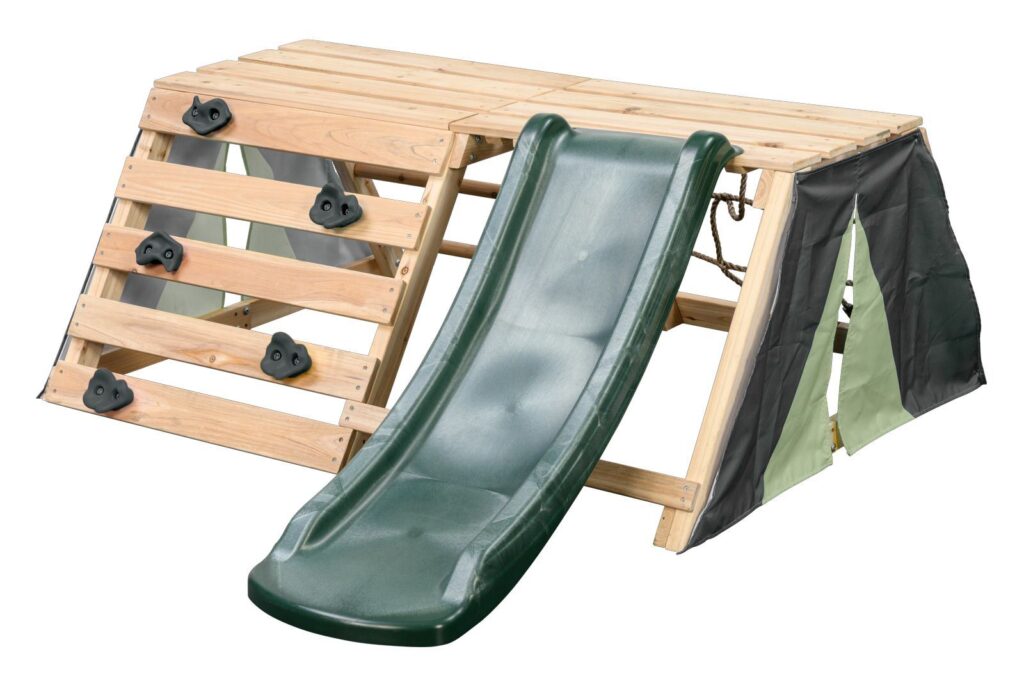 • Inclusief glijbaan van 1,2 meter, klimstenen, klimnet en speelse doeken