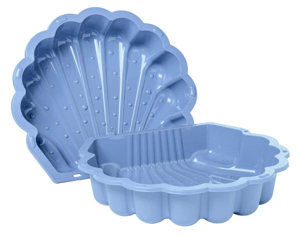 Zandbak in vorm van een schelp. Naast zand is het ook mogelijk om de zandbak te vullen met water, of om hem te gebruiken als ballenbak. Door de deksel bescherm je het zand of water tegen ongedierte en vuil.