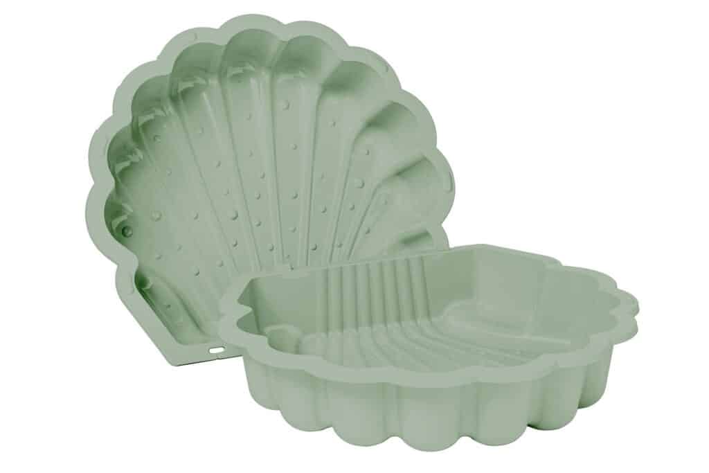 Zandbak in vorm van een schelp. Naast zand is het ook mogelijk om de zandbak te vullen met water, of om hem te gebruiken als ballenbak. Door de deksel bescherm je het zand of water tegen ongedierte en vuil.
